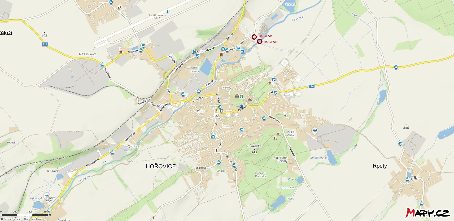 | Popis: | Situace s vyznačením umístění řešených mostů |